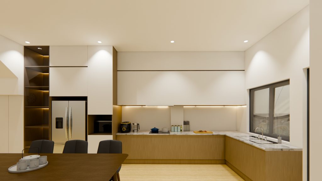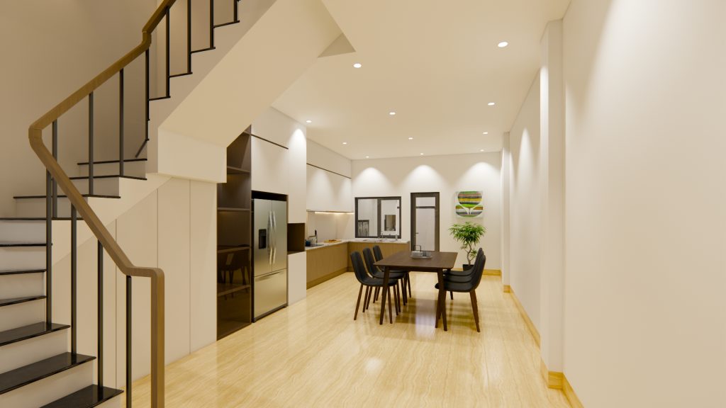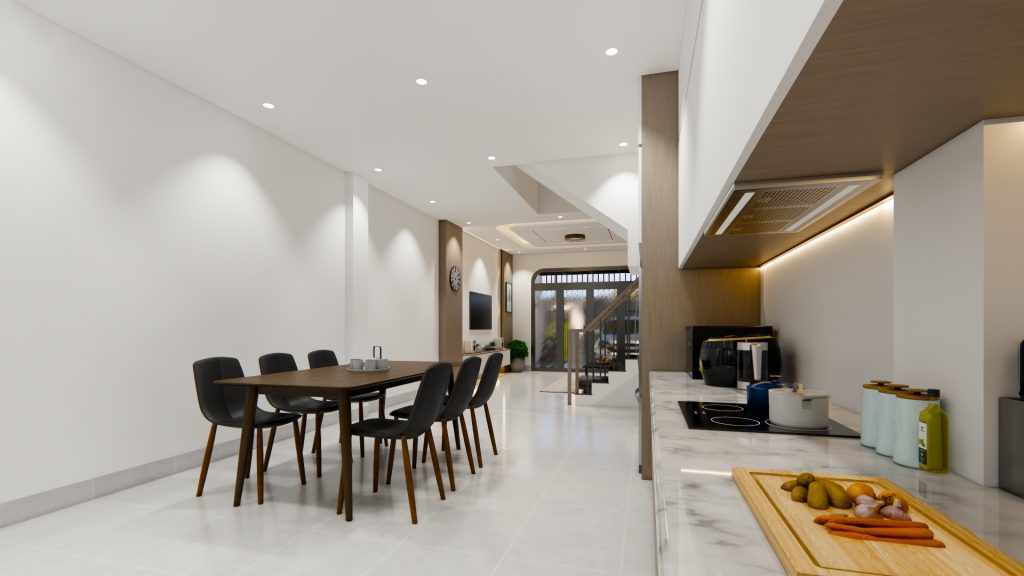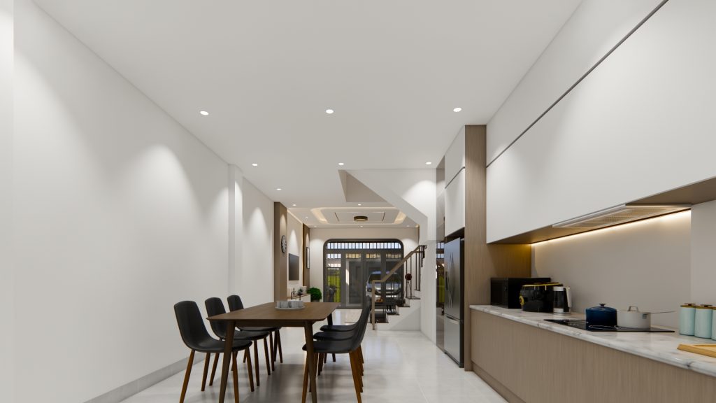 Phòng bếp được bố trí khoa học, hiện đại, tiết kiệm diện tích và tối ưu không gian với hệ tủ bếp tiện nghi dưới gầm cầu thang; khu vực bàn bếp liền kề tạo sự thuận tiện. Việc bố trí thêm cửa kính thông với sân sau tạo cảm giác liền mạch cho khu vực tầng trệt, giúp không gian mở thoáng sáng.