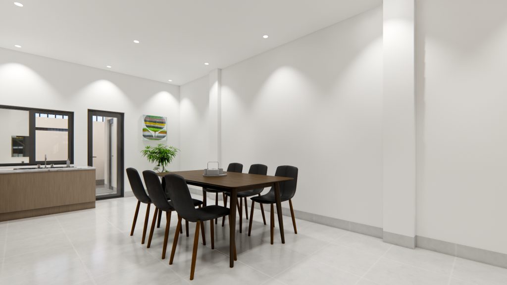 Tầng trệt được bố trí hợp lý, kết nối sân trước, phòng khách, phòng bếp, khu vực bàn ăn, WC và sân sau tạo thành một không gian liền mạch. Thiết kế mở giúp ánh sáng tự nhiên và không khí lưu thông dễ dàng, mang lại cảm giác thoáng đãng và thoải mái. Tổng thể tầng trệt cân bằng giữa tiện nghi, công năng và sự ấm cúng, tạo nền tảng vững chắc cho cuộc sống gia đình.