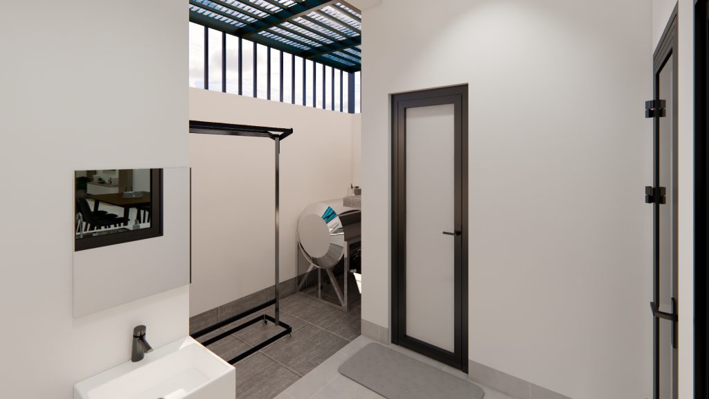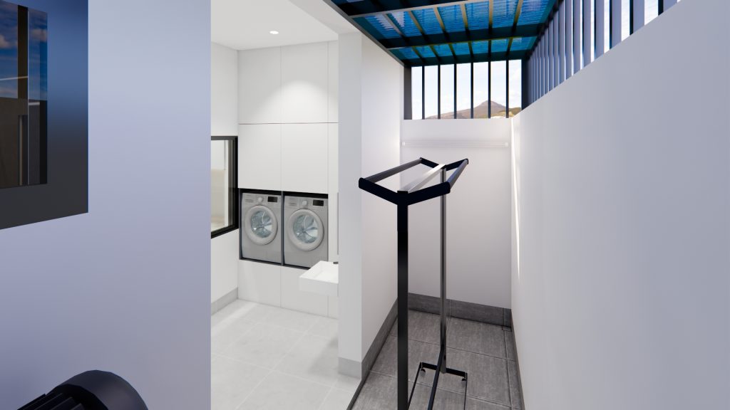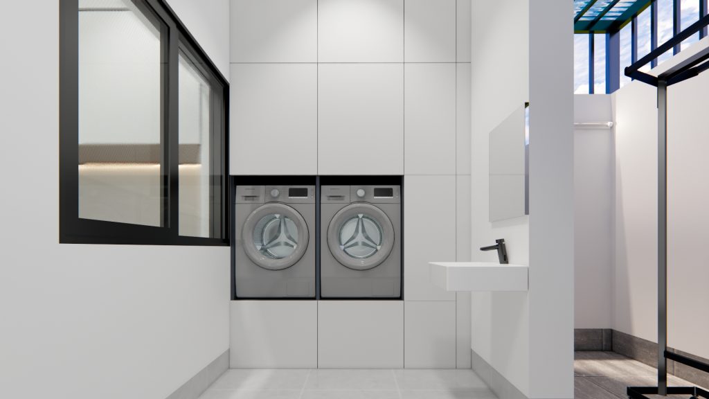 Khu vực WC được thiết kế tiện nghi, hiện đại với trang thiết bị chất lượng, đảm bảo sự thoải mái và thuận tiện cho sinh hoạt hằng ngày. Sân sau được sử dụng thanh sắt song song và mái lưới giúp không gian rộng rãi, thông thoáng; có thể bố trí khu vực giặt, phơi đồ tiện lợi cùng bồn nước hợp lý, giúp tối ưu công năng sử dụng.