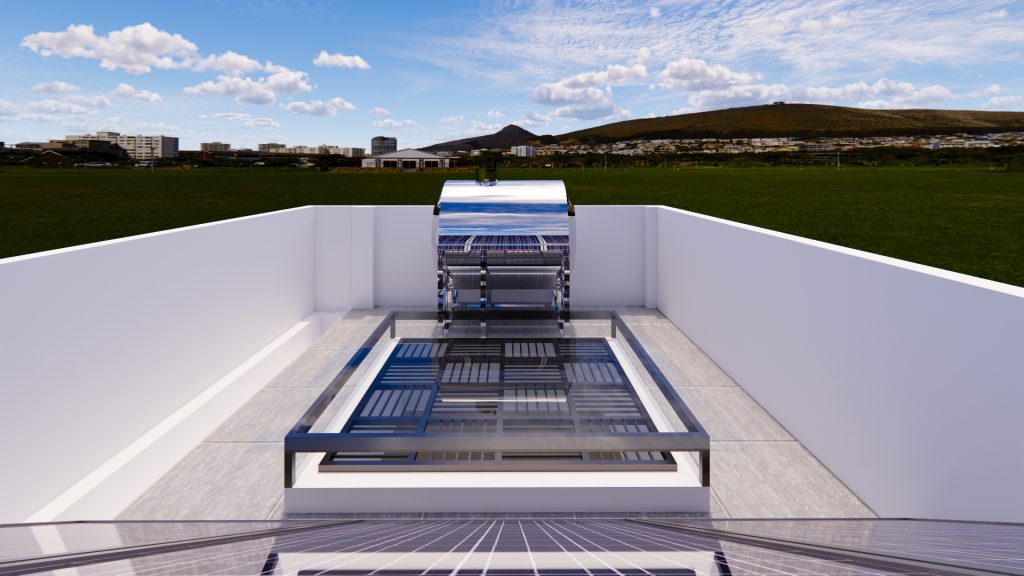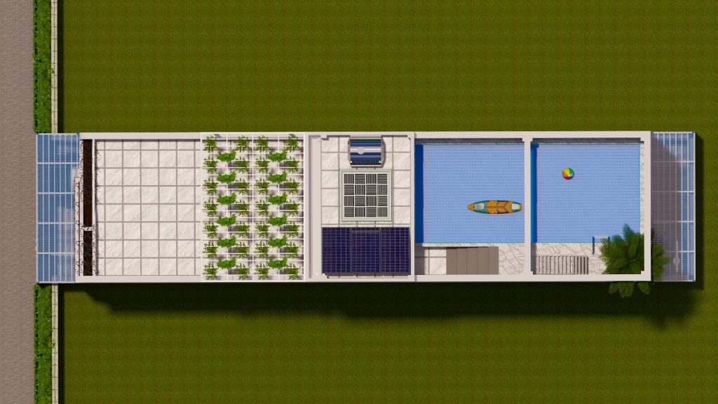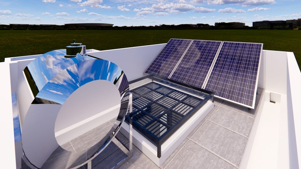 – Khu vực mái của ngôi nhà được thiết kế tối ưu với sự kết hợp giữa bồn nước và hệ thống pin năng lượng mặt trời hiện đại. Việc đặt bồn nước và hệ thống điện năng lượng giúp ổn định nguồn nước sử dụng cho các tầng trên và giảm thiểu chi phí điện năng, vừa tiết kiệm diện tích sử dụng trong nhà. Bên cạnh đó, giếng trời có khung bảo vệ giúp đón ánh sáng và lưu thông không khí hiệu quả, tạo sự thông thoáng cho toàn bộ ngôi nhà. Thiết kế mái không chỉ chú trọng tính kỹ thuật mà còn hài hòa về thẩm mỹ, mang lại sự tiện nghi và hiện đại cho gia đình.