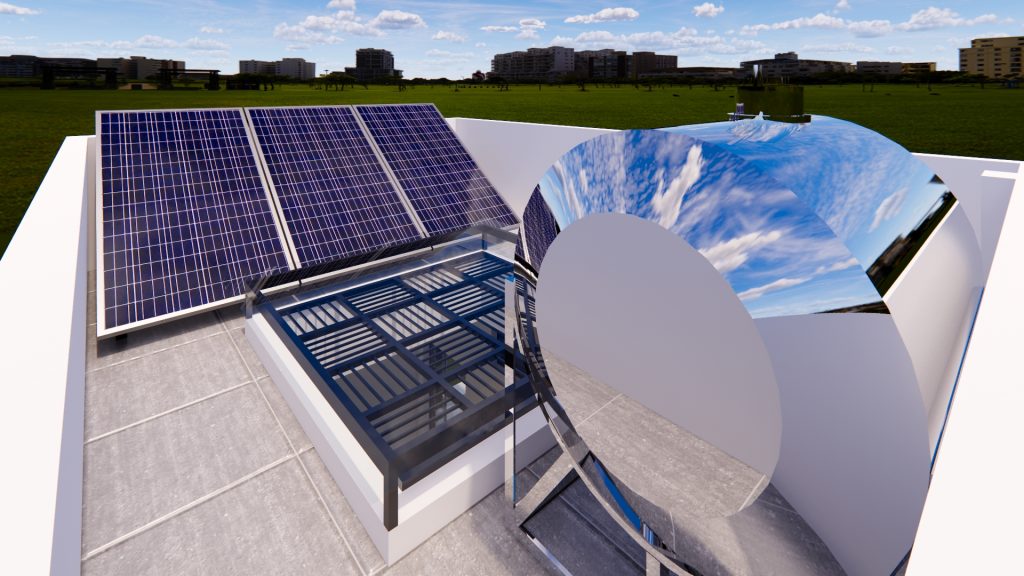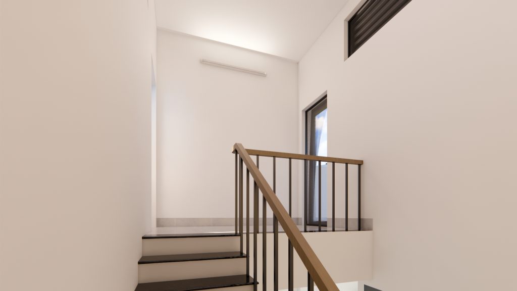 – Khu vực mái của ngôi nhà được thiết kế tối ưu với sự kết hợp giữa bồn nước và hệ thống pin năng lượng mặt trời hiện đại. Việc đặt bồn nước và hệ thống điện năng lượng giúp ổn định nguồn nước sử dụng cho các tầng trên và giảm thiểu chi phí điện năng, vừa tiết kiệm diện tích sử dụng trong nhà. Bên cạnh đó, giếng trời có khung bảo vệ giúp đón ánh sáng và lưu thông không khí hiệu quả, tạo sự thông thoáng cho toàn bộ ngôi nhà. Thiết kế mái không chỉ chú trọng tính kỹ thuật mà còn hài hòa về thẩm mỹ, mang lại sự tiện nghi và hiện đại cho gia đình.