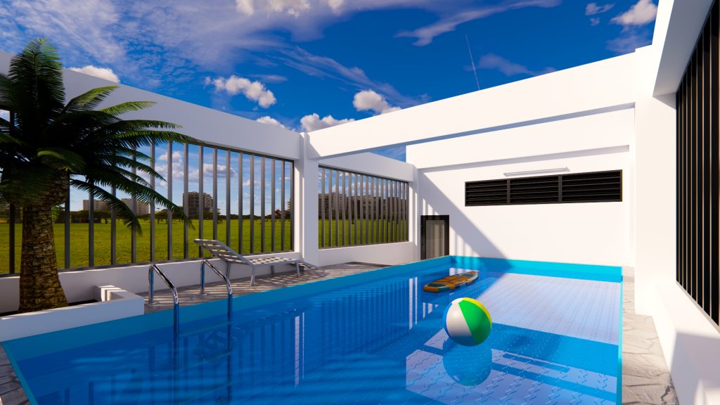 Tầng thượng: Sân trước, mái nhà (bố trí hệ thống điện mặt trời, bồn nước), hồ bơi.