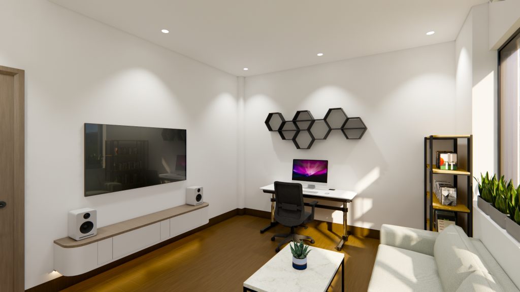 – Mặt tiền: Kiểu dáng vuông vức, phối trắng và màu gỗ sang trọng, hiện đại, tăng thêm khả năng hấp thụ ánh sáng; có thiết kế cửa kính thông ra ban công giúp căn phòng thông thoáng hơn.